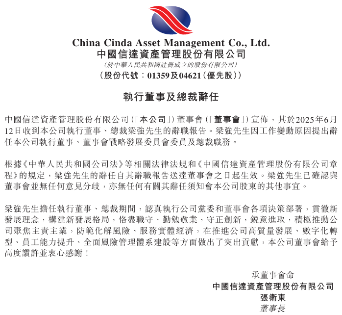 6月13日,中国信达(01359)发布公告,董事会宣布,其于2025年6月12日收到本公司执行董事、总裁梁强先生的辞职报告。梁强先生因工作变动原因提出辞任本公司执行董事、董事会战略发展委员会委员及总裁职务。