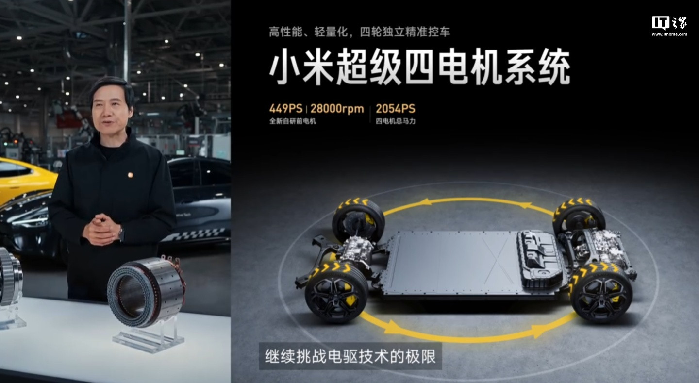 小米超级四电机系统迎来升级,包括2个全新自研电机+2个V8s电机,最大马力可达2054PS。全新自研前电机最高转速可达28000rpm,单电机最大马力449PS富兴配资端,单电机峰值扭矩380N・m。